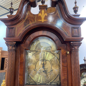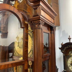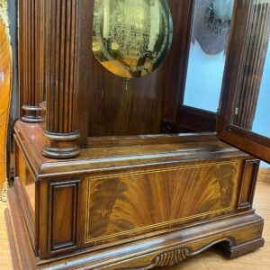 Đồng hồ đứng Sligh thường được chế tác từ gỗ tự nhiên, chọn lọc kỹ lưỡng theo từng vân, từng màu. Thợ thủ công của hãng không chỉ đóng tủ — họ tạo ra một “khung thời gian”, nơi ánh sáng, màu gỗ và chất âm hòa vào nhau thành một tổng thể hài hòa.